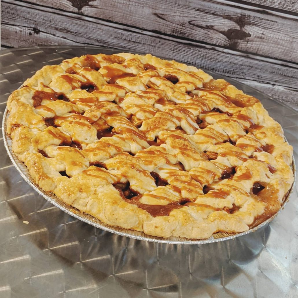A 12″ pie with sweet and tart apples and salted caramel